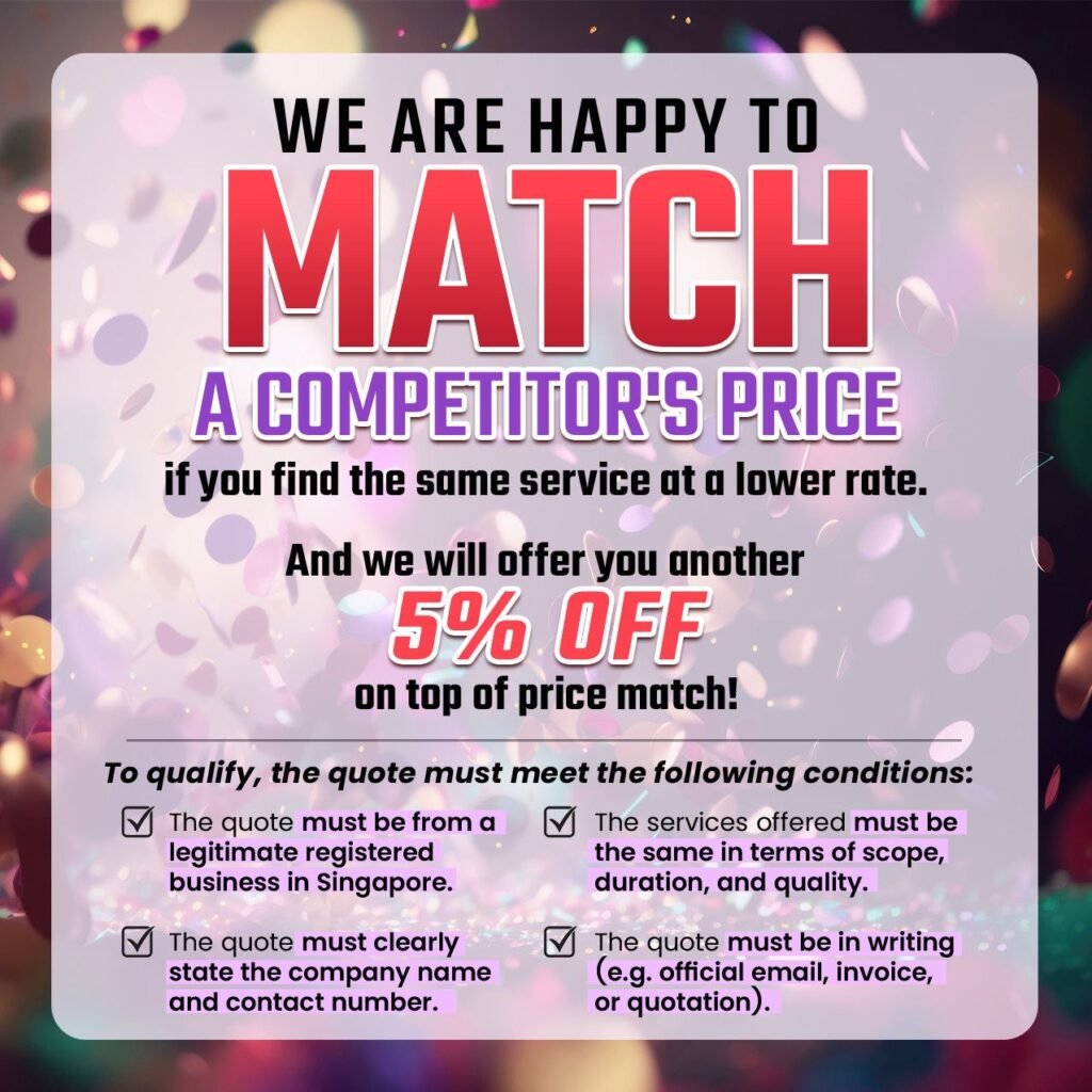 We are committed to offering you the best value. If you receive a lower valid quote for the same scope of work from a competitor, we will match that price and reduce it by a further 5%. (Terms and conditions apply).
